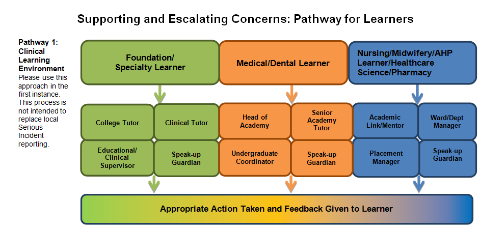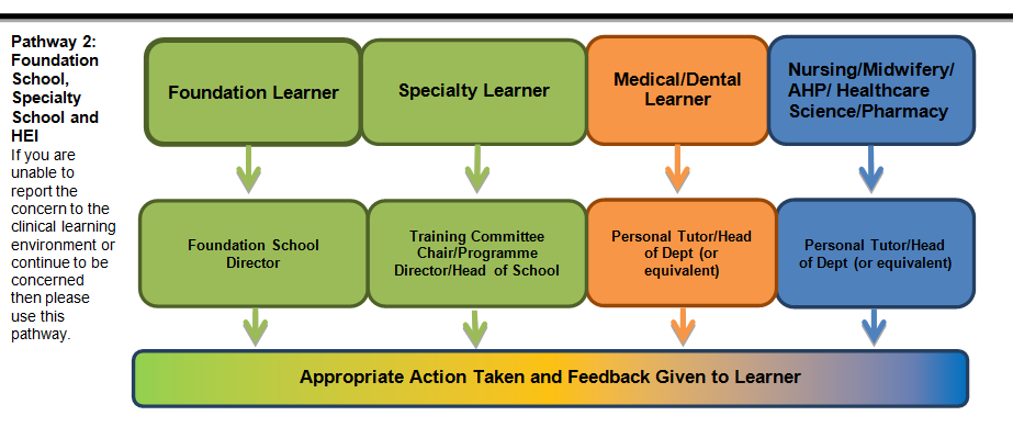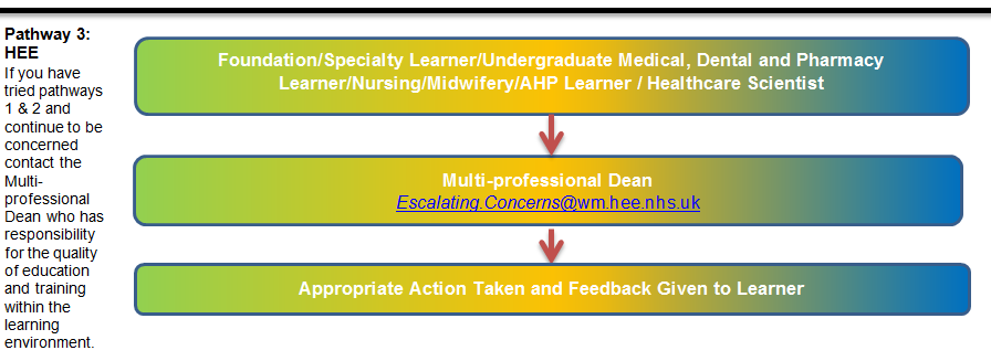 Health Education England West Midlands (HEE WM) believes that it is important that Healthcare Learners are able to raise and where appropriate escalate concerns. The below chart highlights the ways in which you can do this. You are encouraged to follow the appropriate pathway, starting with reporting the concern within your clinical learning environment in the first instance.